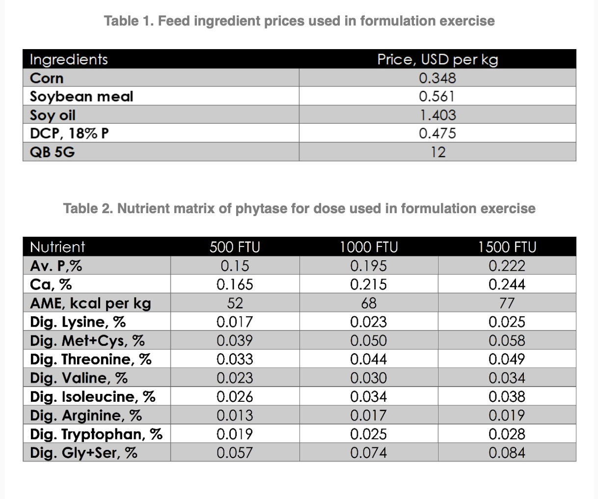The aim of this short communication was to provide an update on the potential feed cost savings associated with phytase use. A commercial-type, broiler grower diet, with 3000 kcal per kg AME and 1.08% digestible lysine was used as a reference and the current prices of feed ingredients in the Asian market were used for feed formulation (Table 1). The official nutrient matrix of Quantum Blue phytase was used in this exercise (Table 2). Figure 1 summarized feed cost savings when three doses of Quantum Blue i.e., 500, 1000, and 1500 FTU were applied each using mineral-only, mineral plus energy, or mineral plus energy plus amino acids matrix.