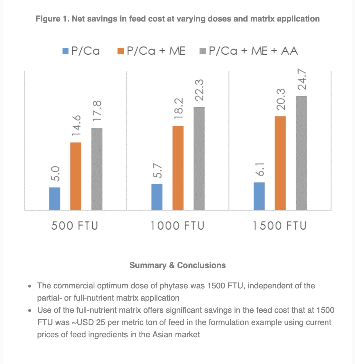 In the early years of phytase journey, it was common to apply a dose of phytase delivering 500 FTU per kg of finished feed, using phosphorus and calcium matrix. With the development of more efficient-phytases, the possibility of more complete phytate hydrolysis became reality. Published evidence strengthened the view that more complete phytate hydrolysis offers significant sparing of dietary energy and amino acids. In view of the high cost of energy and amino acids, the feed costs savings associated with the use of full-nutrient matrix of phytases were substantially higher than those obtained by the application of mineral-only matrix.